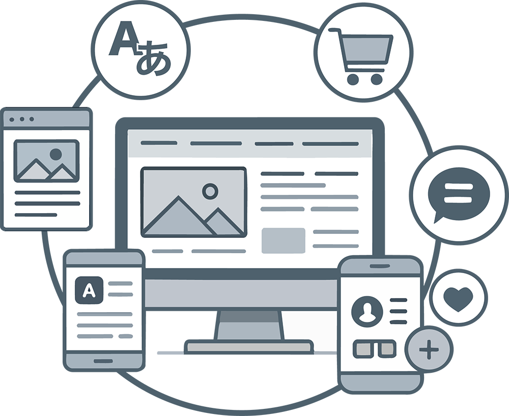 情報発信を強化するブログ構築、海外展開を意識した多言語対応サイト、オンラインショップとの連携にも対応。 WordPressを活用してお客様自身が更新出来るサイト運用や、SNS、SEO対策など、ビジネスに最適なWEB環境を提供します。